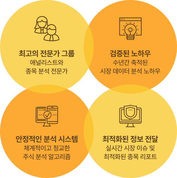 국내외 경제 흐름과 기업의 내재 가치를 정밀하게 분석하고 증시의 변동성 속에서도 흔들리지 않는 유망 종목을 발굴하여, 고객 중심의 밀착 케어 서비스를 지향합니다. 업계 최고 수준의 전문 인력을 배치하여 시장의 이슈에 누구보다 빠르게 대응하며, 차별화된 투자 성공의 길을 안내합니다